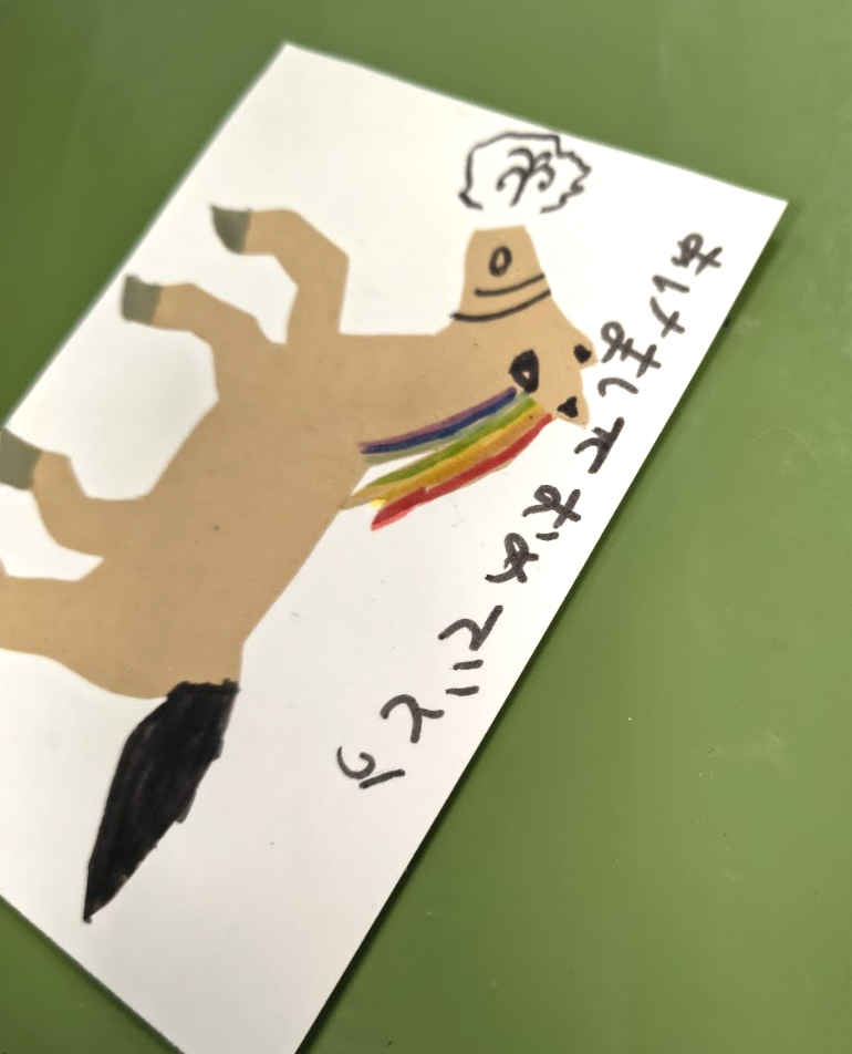 ↑お月見飾り。年末には、毎年恒例の紙芝居「干支のはじまり」を読み、2026年は午年だと知りました。授業の終わりには年賀状を制作。日本の家族やお友達に送ってみよう!