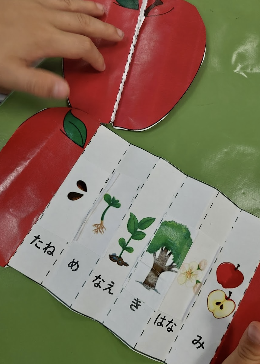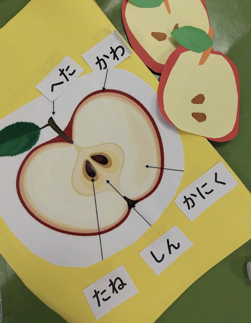 秋冬のくだものであるりんごについても取り上げ、くだもののパーツの名前や、成長過程を「りんごのライフサイクル」として学習しました。
