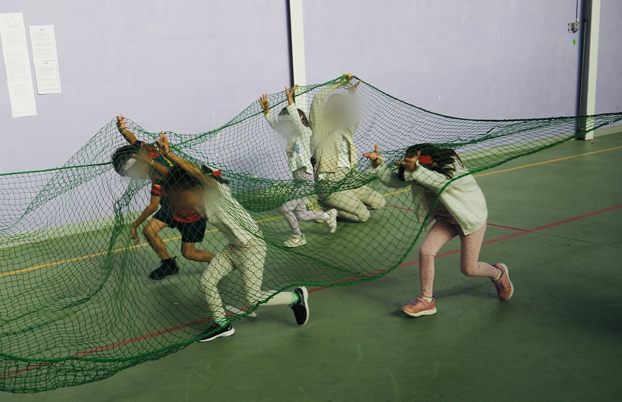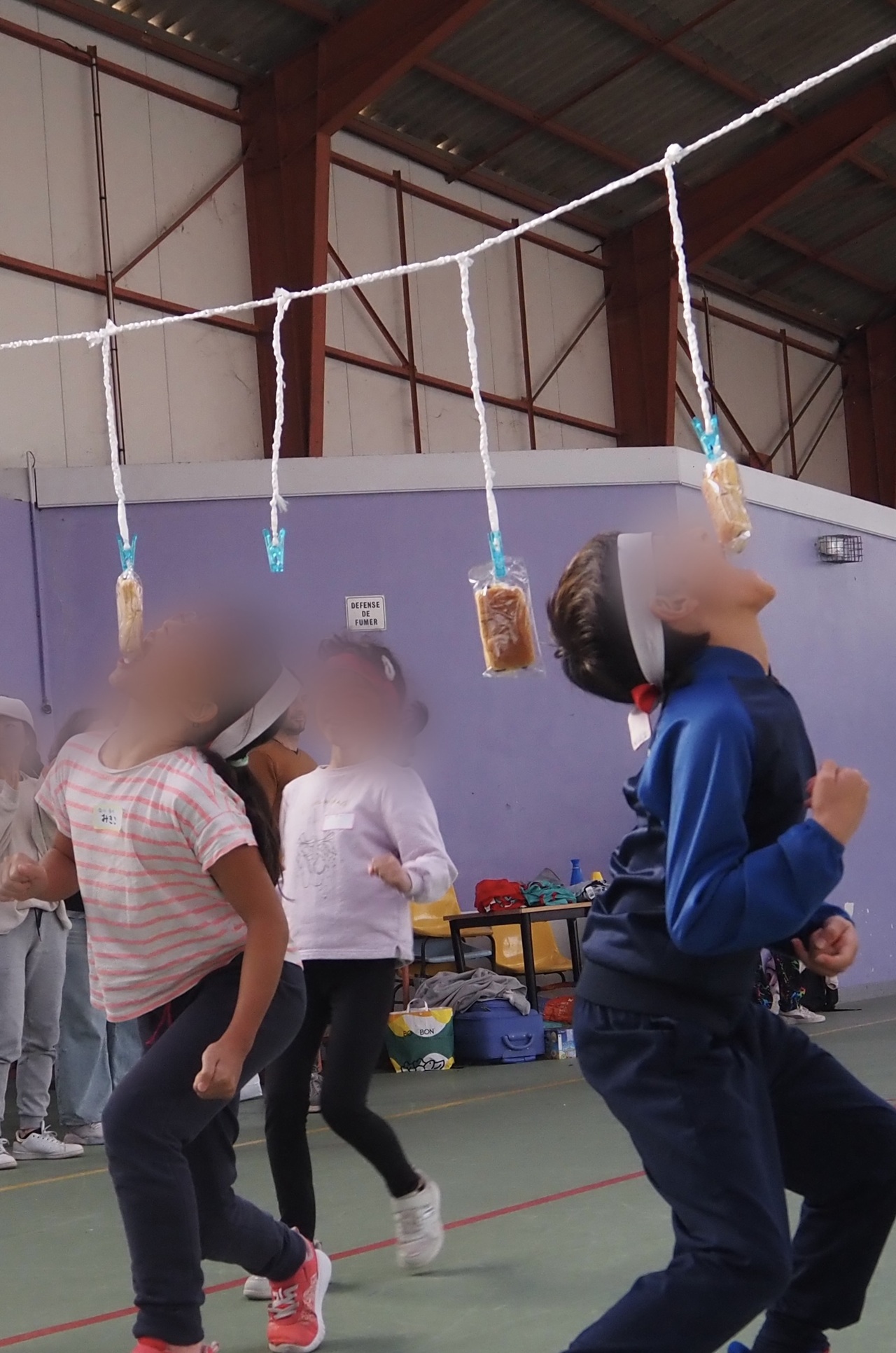 小学生、中学生は網をくぐり、ジャガイモの袋に入ってジャンプで進み、最後はパンをくわえてゴール。
